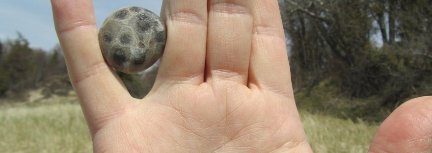I looked down the shoreline to watch my husband hunt stones. He was standing like a human question mark *, head bent, shoulders hunched, knee-deep in the mirror-calm melted ice. No need for him to yodel like the loon, he knew I was nearby. We have haunted these waters together for 45 years. We know each other so well, and share a simple but never stale delight when one of us finds a particularly beautiful petoskey stone.